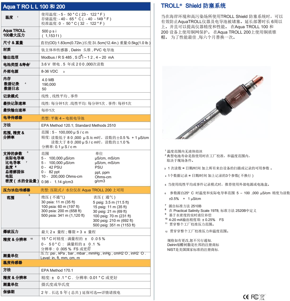 使用Aqua TROLL 200 测量并记录水位,水压,电导率和温度, 或者使用Aqua TROLL 100 仅测量并记录电导率和温度。独特的电导池考虑到宽量程,高精度的测量在一个直径细小的仪器上。( 小于1英寸 ) .